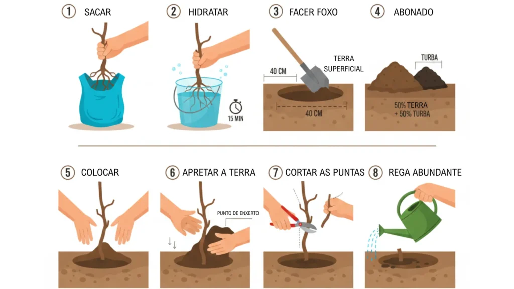 Consello de Post-Plantación: Se plantas nunha época de moita calor ou vento, podes realizar un pequeno aporcado (amontoar un pouco de terra na base) para manter a frescura, pero asegúrate de que o punto de enxerto respire e non quede enterrado baixo lodo.